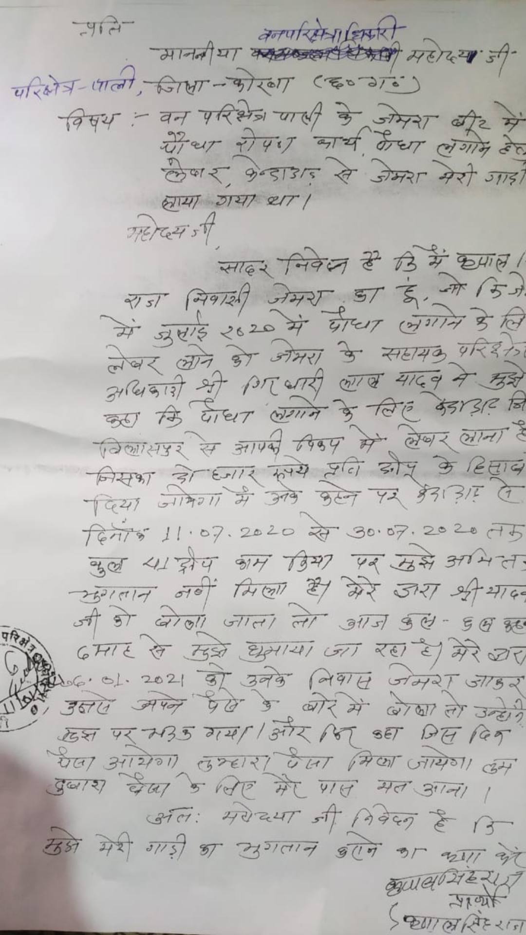 शिकायत में उन्होंने बताया कि जुलाई 2020 में पौधा लगाने के लिए ग्राम केंदडाँड़ से लेबर लाने के बारे में जाने के लिए जेमरा के सहायक परिक्षेत्राधिकारी गिरधारीलाल यादव द्वारा उसकी पिकअप को 2 हजार रुपए प्रति ट्रिप के हिसाब से किराए में अधिग्रहित किया गया था, जहां 11 से 30 जुलाई तक तक कुल 41 बीटा वाहन का परिचालन हुआ जिसका भुगतान के लिए 6 महीने से डिप्टी रेंजर द्वारा आज- कल कहकर धुमाया जा रहा है और बीते 06 जनवरी 2021 को उनके जेमरा स्थित आवास पर वाहन किराया मांगे जाने पर भड़कते हुए हुए कि जिस दिन पैसे होंगे उस दिन दूंगा फिर आप पैसे मांगने मेरे पास मत आते हैं। भवण मालिक ने 11 जनवरी को इसकी लिखित शिकायत शिफ्ट वनपर मिशनेत्राधिकारी से कर वाहन किराया दिलाए जाने की मांग की है।